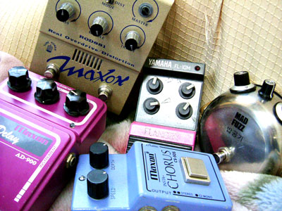 、CS-505 、AD-900 、YAMAHAのフランジャー、MAD FUZZ、JCのコーラスなどです。歪みはアンプの歪みが多いです。ベースは